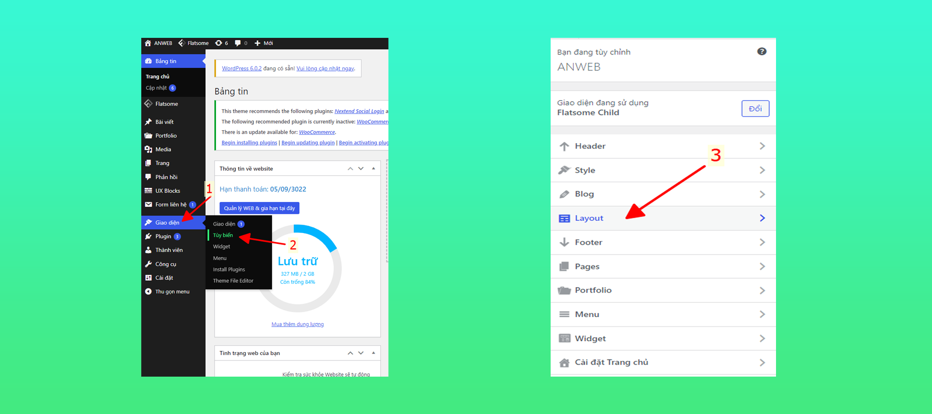 Vào website của bạn, chọn Flatsome ➙ Theme Options ➙ Layout hoặc vào trang Quản trị (Admin) (thường có dạng https://tên-miền-của-bạn.com/wp-admin) chọn Giao diện ➙ Tùy biến ➙ Layout