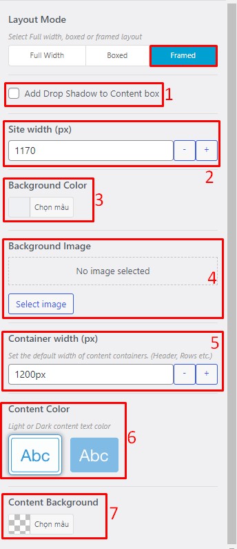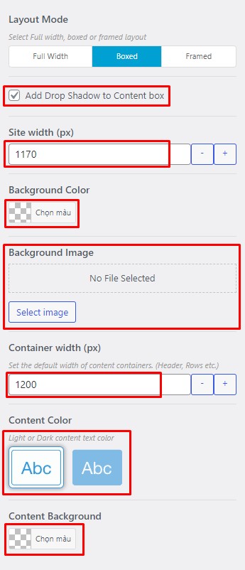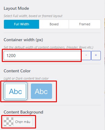 Container width (px) là Độ rộng của vùng chứa nội dung (Kích cỡ của nó được tính bằng pixel – px). Bạn thay đổi con số này thì độ rộng của website sẽ thay đổi (Lưu ý: hãy để mặc định, không nên thay đổi con số này)