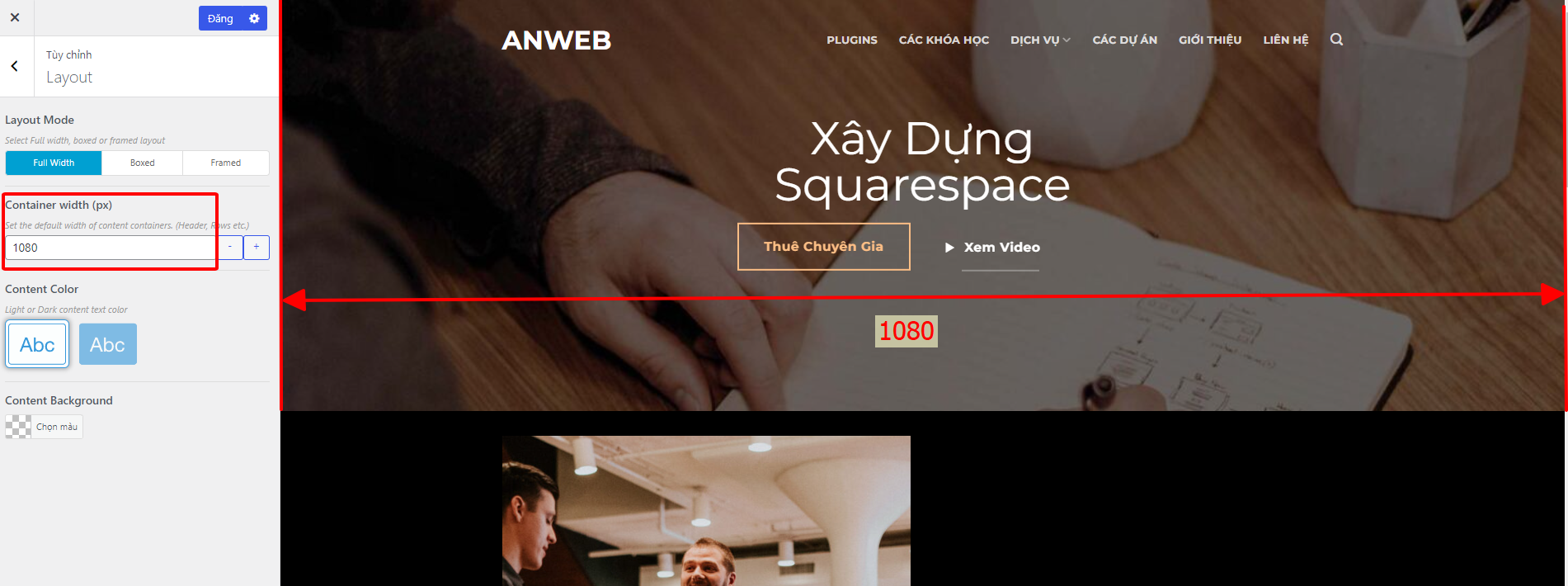 Tại khu ô Container Width bạn có thể thay từ 1080 thành 1300 để kích thước layout nội dung website được rộng ra.