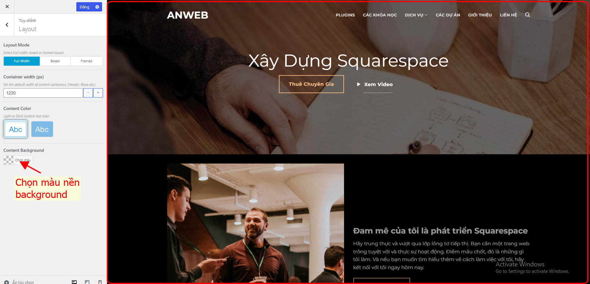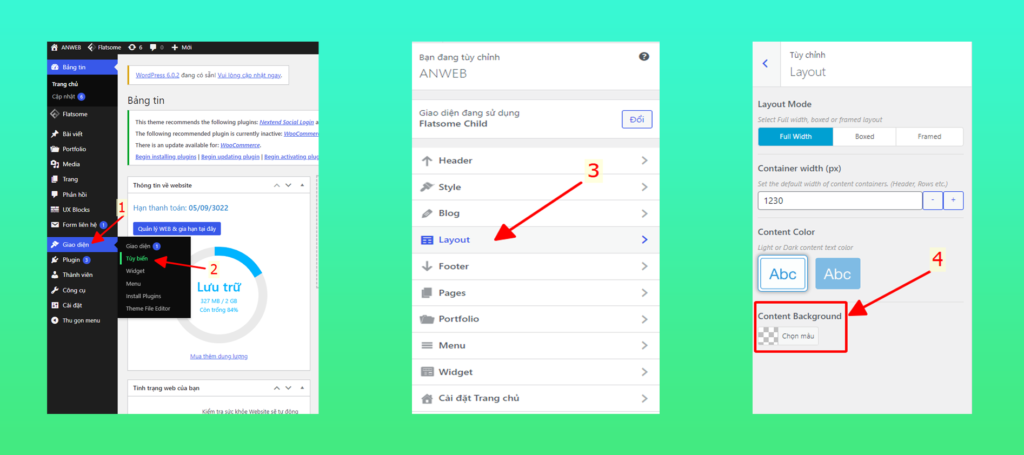 Bạn sẽ vào Layout để đổi màu cho background. Bạn vào Giao diện > Tùy biến > Layout > Content Background