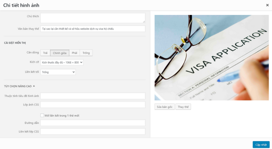 Một số WordPress bạn sẽ cần chỉnh sửa một số thông tin cơ bản về hình ảnh. Chẳng hạn như canh hình ảnh nằm giữa website. Hoặc chọn kích thước ảnh, thêm nội dung thay thế cho hình ảnh… Sau đó tùy giao diện để bấm Ok, done hoặc update là được.