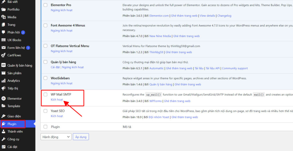 Bước 1: Vào trang Quản trị (admin) của website. Chọn Plugin, kéo chuột xuống mục WP mail SMTP, sau đó nhấn nút Kích hoạt
