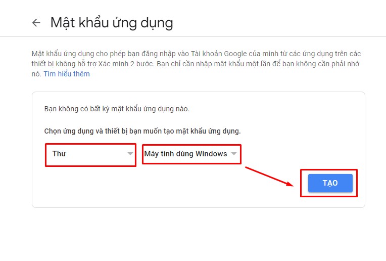 Bước 12: Ở đây, mục Lựa chọn ứng dụng chọn là Thư/Mail còn mục Lựa chọn thiết bị thì chọn gì cũng được. Sau đó nhấn nút TẠO