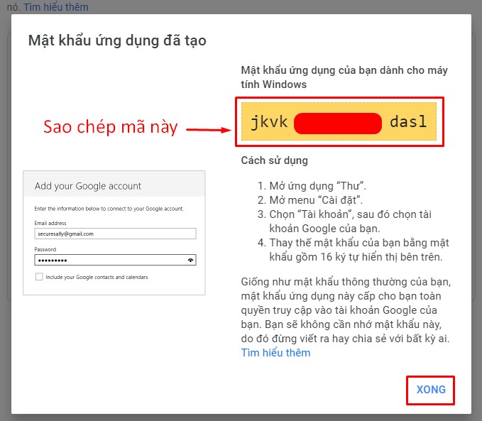 Bước 13: Mật khẩu ứng dụng đã được tạo. Bạn vui lòng sao chép mã mật khẩu như hình bên dưới. Sau đó nhấn nút XONG và chuyển sang bước tiếp theo