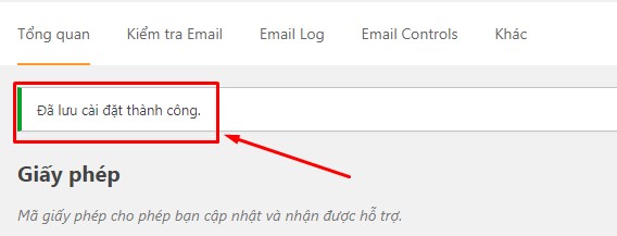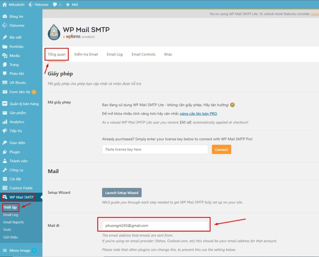 Bước 14: Quay lại trang Quản trị (Admin) của website như ở bước 2. Sau đó nhấp vào WP Mail SMTP –> Thiết lập –> Tổng quan