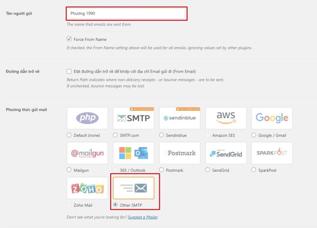 Ghi tên người gửi Email. Ở mục Phương thức gửi mail, bạn chọn Other SMTP