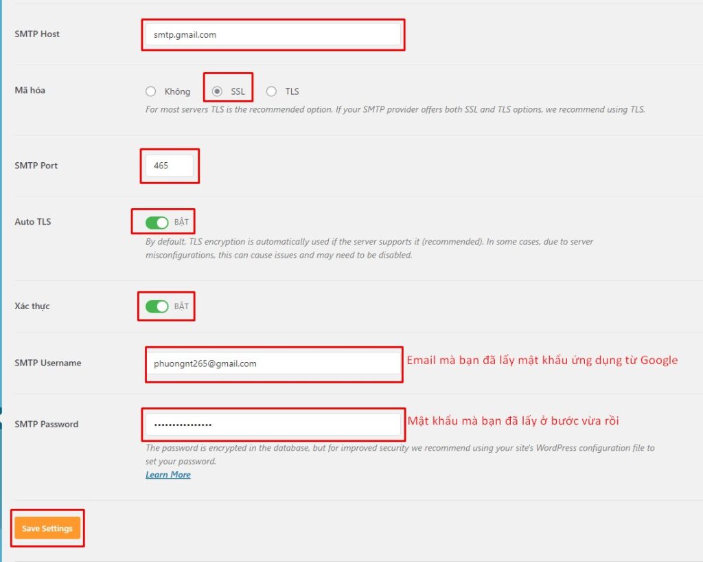 Chọn đúng như hình bên dưới. Riêng mục SMTP Username bạn vui lòng nhập đúng Email mà bạn đã lấy mật khẩu ứng dụng từ Google. Đối với mục SMTP Password: bạn hãy dán mật khẩu ứng dụng mà bạn đã sao chép ở bước 13. Sau đó nhấn nút Save Settings