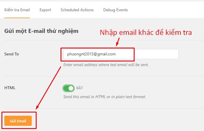 bạn nhập 1 email khác để kiểm tra xem việc tích hợp SMTP của Gmail đã thành công hay không và sau đó nhấn nút Gửi Email
