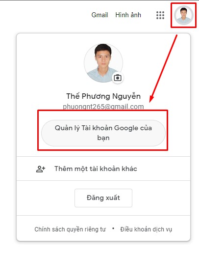 Bước 3: Mở 1 tab mới trên trình duyệt, sau đó đăng nhập vào tài khoản Gmail của bạn. Nhấn vào hình Avatar ngay góc phải phía trên cùng, chọn Quản lý tài khoản Google của bạn. Hoặc bạn vào theo link này: https://myaccount.google.com/