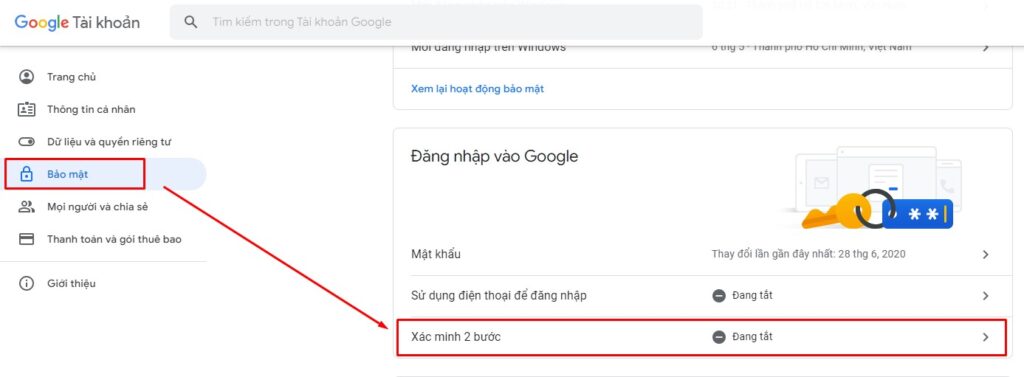 Bước 4: Chọn Bảo mật –> Xác minh 2 bước. (nếu bạn đã bật bảo mật 2 lớp, vui lòng chuyển qua Bước 11)