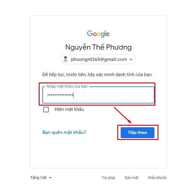 Bước 6: Nhập mật khẩu Gmail sau đó nhấn nút Tiếp theo