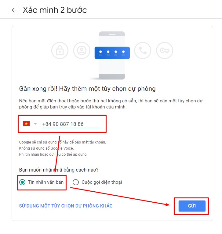 Bước 8: Nhập số điện thoại của bạn, sau đó chọn Tin nhắn văn bản và nhấn nút GỬI