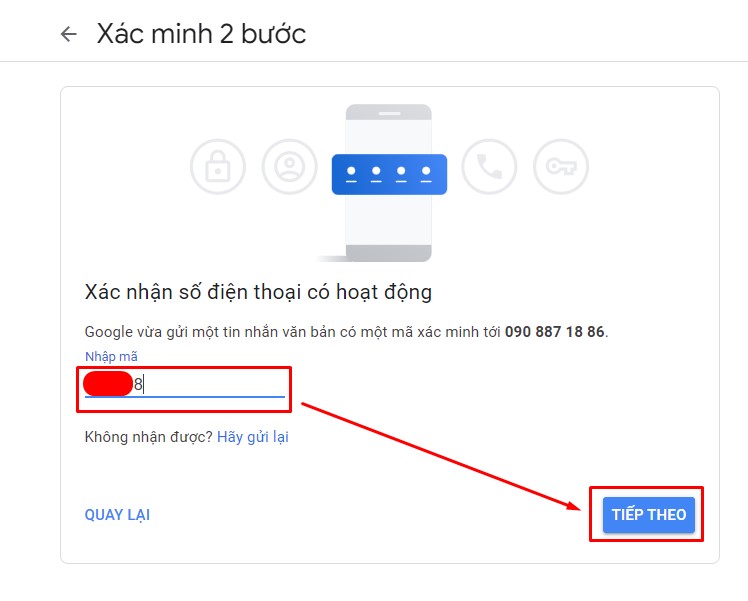 Bước 9: Kiểm tra tin nhắn SMS từ Google, mã xác minh gồm 6 ký tự, hãy nhập mã đó vào ô Nhập mã và nhấn nút TIẾP THEO. (Lưu ý: Nếu lâu quá không nhận được tin nhắn SMS, vui lòng nhấn nút Hãy gửi lại hoặc đổi sang số điện thoại khác)