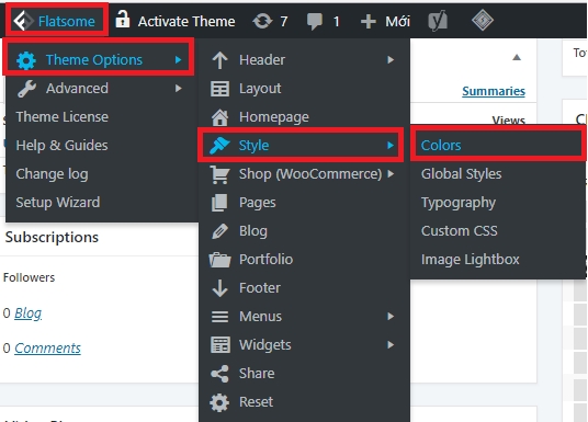 Hầu hết tùy biến màu sắc đều thông qua Menu Theme options: Flatsome -> Theme Options -> Style -> Color
