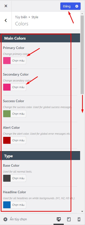 Flatsome cho phép bạn tùy biến màu sắc như: màu chủ đạo, màu sắc chung của văn bản, đường link. Nếu trong tính năng tùy biến màu sắc của theme không cho phép thay đổi bạn phải sử dụng tính năng Custom CSS để định nghĩa màu sắc theo ý muốn (tất nhiên là bạn phải biết lập trình CSS).